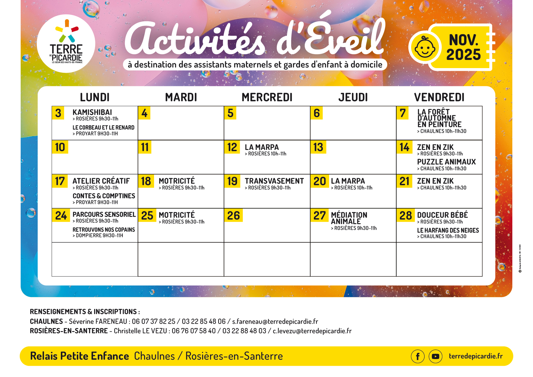 Voici le programme des activités d'éveil des Relais Petite Enfance de Terre de Picardie pour le mois de Novembre 2025. ... Voir plusVoir moins