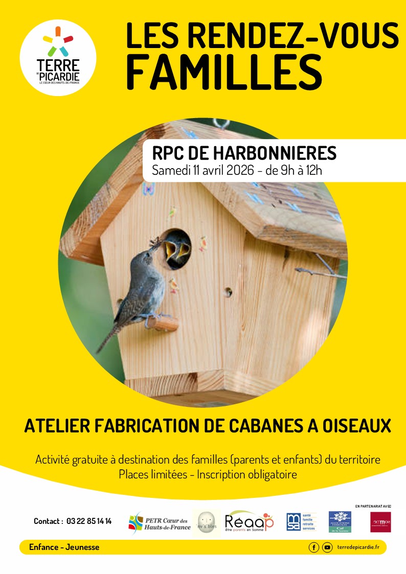 Dans le cadre des Actions de Soutien à la Parentalité, Terre de Picardie propose un rendez-vous familles autour d’un atelier de fabrication de cabane à oiseaux (activité à partir de 6 ans) au périscolaire d’Harbonnières le samedi 11 avril 2026 de 9h à 12h.
