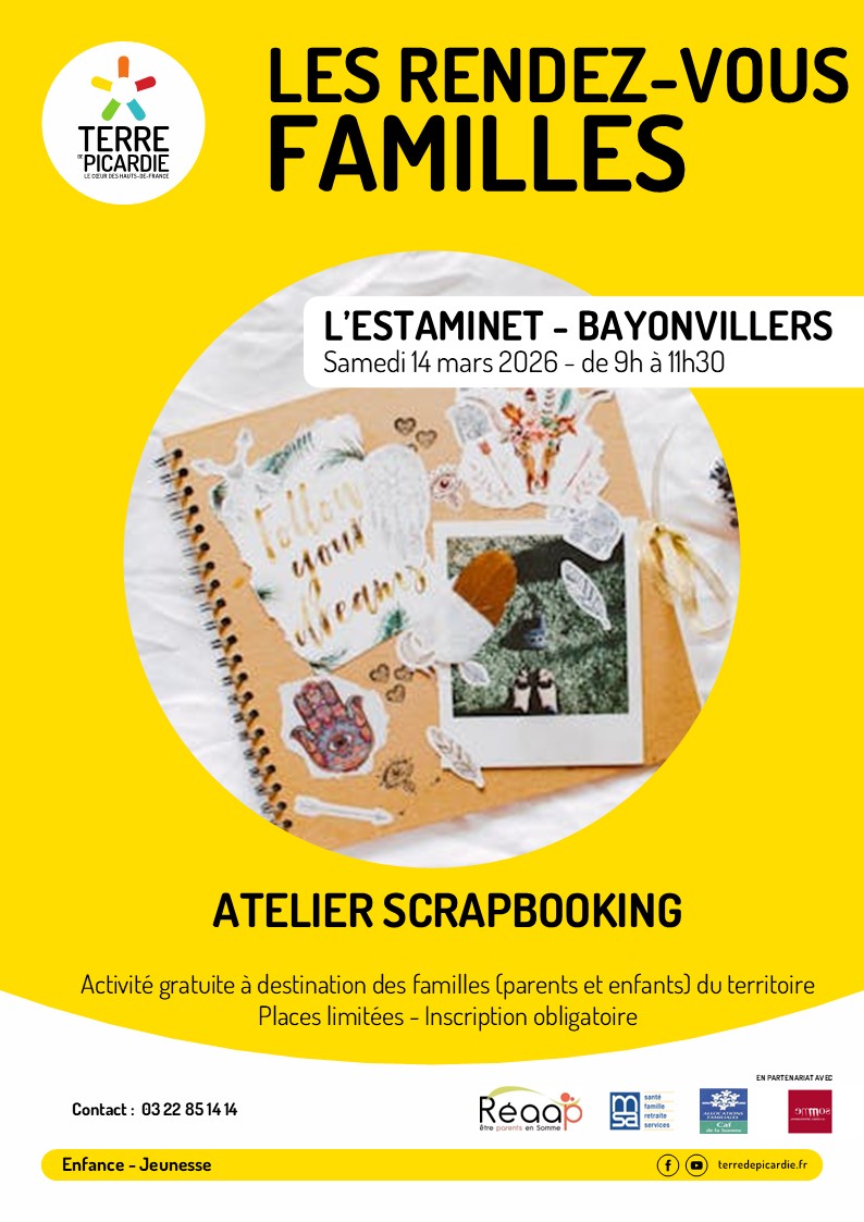 Dans le cadre des Actions de Soutien à la Parentalité, Terre de Picardie propose un rendez-vous familles autour d’un atelier scrapbooking au café associatif l’Estaminet à Bayonvillers – 4 rue de Marcelcave – le samedi 14 mars 2026 de 9h30 à 11h30 (accueil de 9h à 9h30).