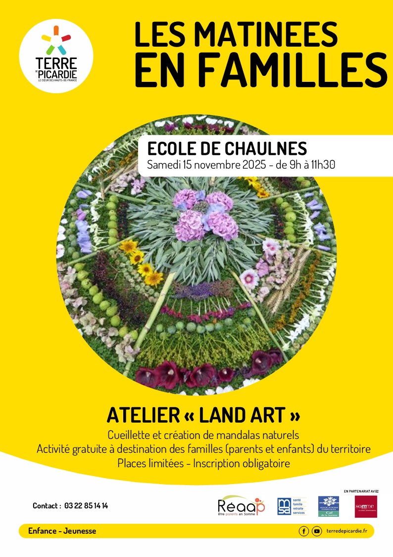Dans le cadre du Réseau d’Écoute, d’Appui et d’Accompagnement des Parents, Terre de Picardie propose un atelier « land art » en famille au RPC de Chaulnes – accueil périscolaire rue Poulin – le samedi 15 novembre 2025 de 9h30 à 11h30 (accueil de 9h à 9h30).